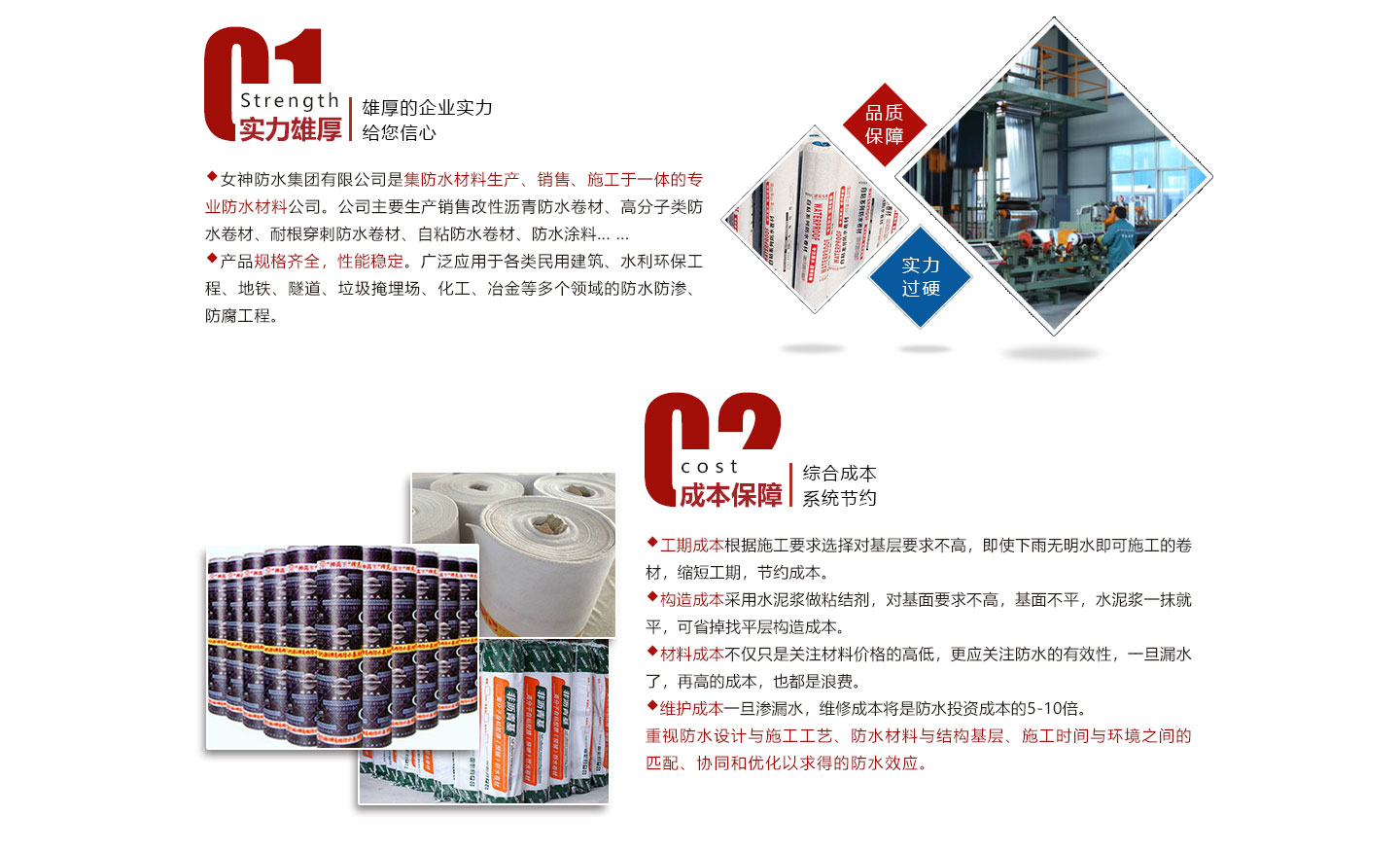 安徽女神建材科技集團(tuán)有限公司是集防水材料研發(fā)、生產(chǎn)、銷(xiāo)售、施工為一體的綜合性防水材料集團(tuán)公司。我公司旗下有多條大型一次成型生產(chǎn)線(xiàn):SBS改性瀝青防水卷材,DTM聚酯復(fù)合高分子防水卷材,非瀝青基高分子防水卷材,PVC,TPO高分子防水卷材等生產(chǎn)線(xiàn)。我公司秉承“創(chuàng)新發(fā)展、實(shí)惠用戶(hù)”為宗旨,確保生產(chǎn)材料基礎(chǔ)上推出“共享生產(chǎn)廠(chǎng)家”,為開(kāi)發(fā)商、建筑商節(jié)約成本為理念,新理念受到用戶(hù)企業(yè)集采時(shí)一致好評(píng)和認(rèn)可。在互聯(lián)網(wǎng)時(shí)代,我公司將以互聯(lián)網(wǎng)“共享”為發(fā)展理念,為開(kāi)發(fā)商、建筑商、防水企業(yè)提供的產(chǎn)品,真正讓用戶(hù)企業(yè)達(dá)到巨大...